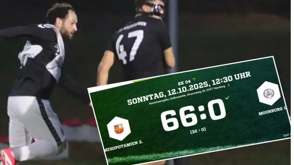 Almanya’nın Hamburg bölgesinde oynanan amatör lig karşılaşması futbol tarihine geçti. Ligin 9. haftasında Mesopotamien 2 ile Moorburg karşı karşıya geldi. Maça sadece 7 futbolcuyla çıkan Moorburg, rakibi karşısında varlık gösteremedi. Mesopotamien 2 sahadan 66-0 gibi inanılması güç bir skorla ayrıldı.